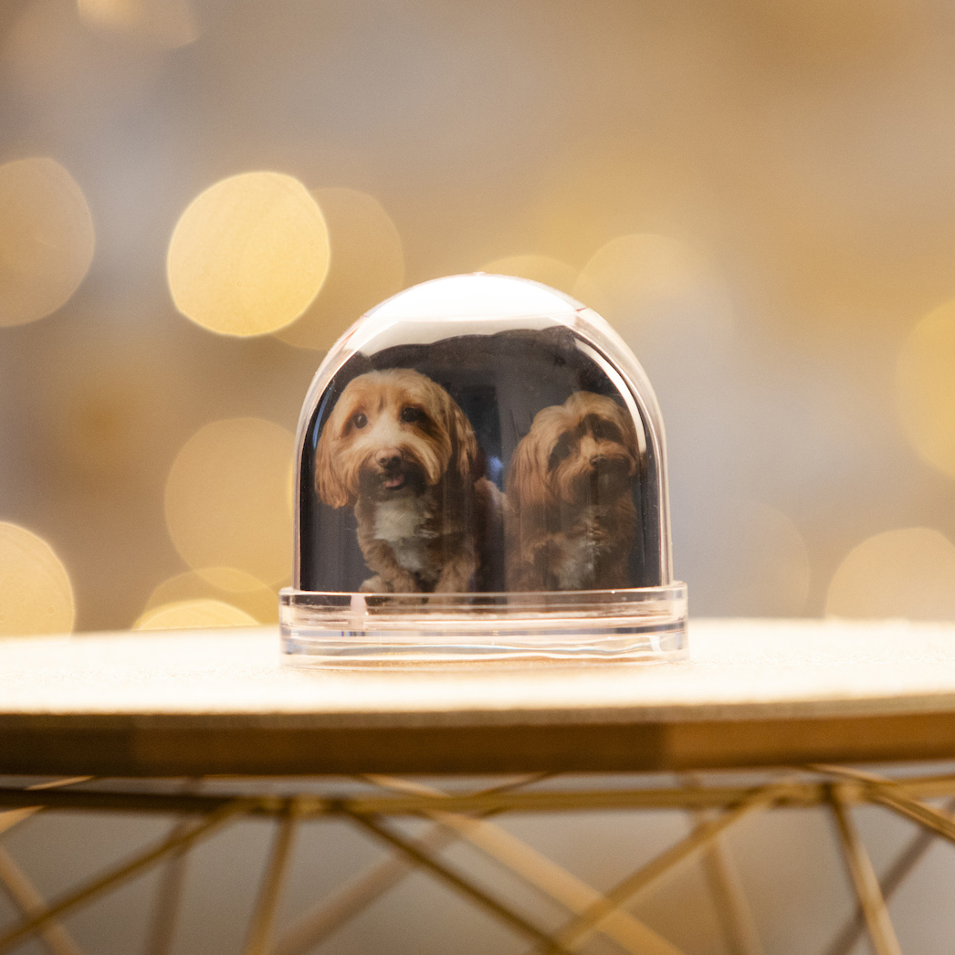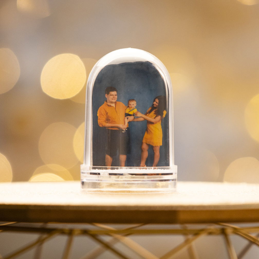Teljesen áttetsző műanyagból van, két oldalú fotó tehető bele. Hópihék úsznak benne.