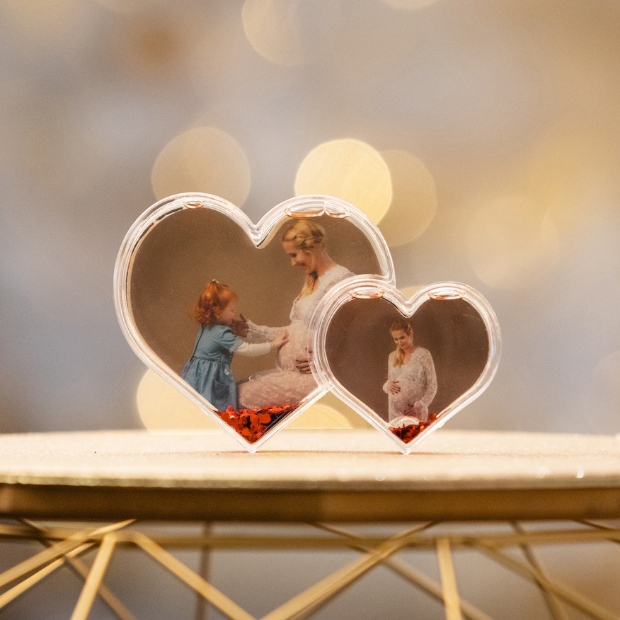 Mindkettő teljesen áttetsző műanyagból van, két oldalú fotó tehető bele. Hópihés és szivecskés változatban is kapható.
